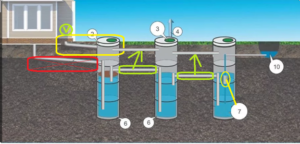 Как видно из рисунка (отмечено желтыми кружками), у нас три колодца по 4 кольца, но можно было бы сделать по 3 кольца в каждом колодце, если бы труба выходила из дома выше, чем показано на рисунке! Сейчас происходит ПЕРЕПЛАТА за лишний материал (3 кольца) и лишнюю работу. Ведь проще копать на глубине 3 метров, чем на 4 метра. На изображении правильный вариант. Как видно из рисунка, теперь труба подходит почти под самую плиту перекрытия колодца, что позволяет использовать весь объем канализации, улучшая отстаивание воды.