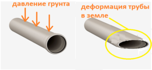 (Использование трубы для внутренних работ) для наружных работ (закапывание в землю). При прокладке труб канализации некоторые неопытные монтажники или заказчики в целях экономии или из-за незнания устанавливают трубу канализации серого цвета (предназначенную для внутренних работ) в траншею, затем закапывают в бетон или в другое недоступное место. Необходимо понимать, что труба для внутренних работ (серого цвета) заведомо слабее оранжевой. Это приводит к тому, что под давлением грунта труба деформируется. Труба под давлением грунта из круглого сечения переходит в овальное , потому в ней могут застрять крупные элементы смываемые в канализацию! Также затруднительна прочистка ее в случаи засора.